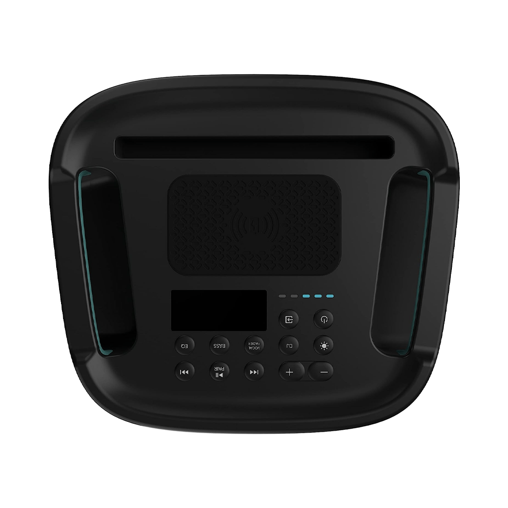On the top, you’ll find most of the speaker’s operational buttons. There’s a large wireless charging pad used to charge supported phones. The digital display shows a number of things too including the Bluetooth connection pairing status, volume, radio frequency, and more. There’s the battery indicator light that shows how much charge the battery has in it.